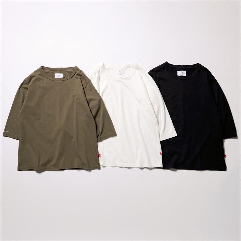 “RUGGED”シリーズは環境への負担を抑えた独自の環境配慮型染色法「BRING OUT」生地を使用したライン。“HAUTE”ラインとは正反対のしっかりとした厚みとハリ・コシのある質感が特徴。右袖には銀糸の刺繍を施し、背中にはセンターハギを施した無骨さのある一枚。(3/4スリーブカットソー)